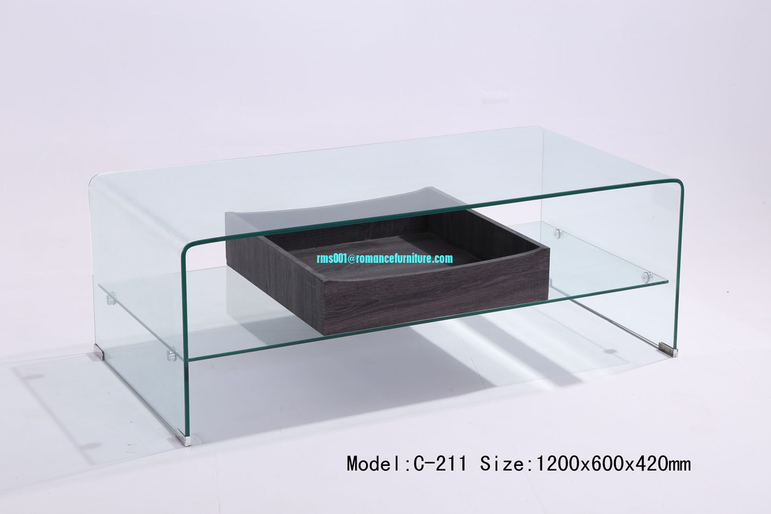 Mesa de centro de vidrio curvado en caliente grande con patas de madera, mesa de centro C211